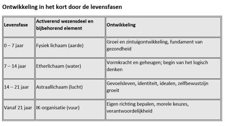 Onderstaande tabel laat in één oogopslag zien hoe de vier wezensdelen en de driedeling van de mens met elkaar verweven zijn.